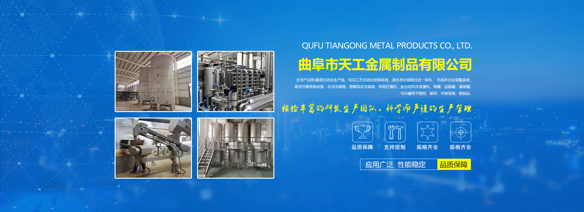 公司擁有功能齊全的化驗室、試驗室,一支高水平的設計研發團隊。機械設備、激光切割機、激光焊接機、數控機床、數字加工中心,氬弧焊、電氣焊、等離子切割機一應俱全。技術力量雄厚,有釀造設備專家3名,工程師5名,大專學歷15名,中專學歷50名,員工全部持有由勞動技術部門,考核頒發的中級以上技術證書。公司配有嚴格的質量管理保證體系。通過了ISO9000質量體系認證,ISO9001質量管理體系認證,獲得多項國家發明專利和實用新型專利。